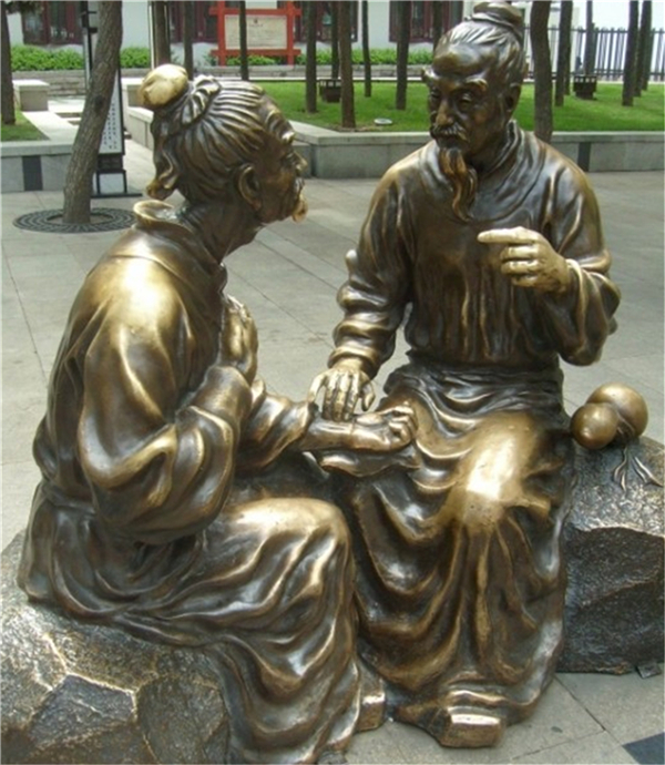 中醫(yī)文化歷史悠久,獨具特色。展現(xiàn)了中醫(yī)在進行號脈問診的情景,放置在醫(yī)院或者中醫(yī)診所是很合適的。鑄銅人物雕塑就是以各種銅雕人物為造型的雕刻藝術,用各種可塑材料或可雕,可刻的硬質(zhì)材料創(chuàng)作出一定的可視,可觸的藝術人物形象。